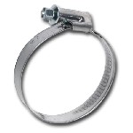 Abrazadera metálica 150-170. Ancho: 12 mm Calidad del material: W2: Fleje y jaula de acero inoxidable. X8Cr17 (DIN 1.4016) (AISI-430) y tornillo de acero cincado QST 34-3 (DIN 1.0213). Utilización: Las abrazaderas metálicas con ancho de fleje de 9 y 12 mm, así como las de acero inoxidable, son empleadas principalmente para los manguitos de agua del sistema de refrigeración del automóvil.