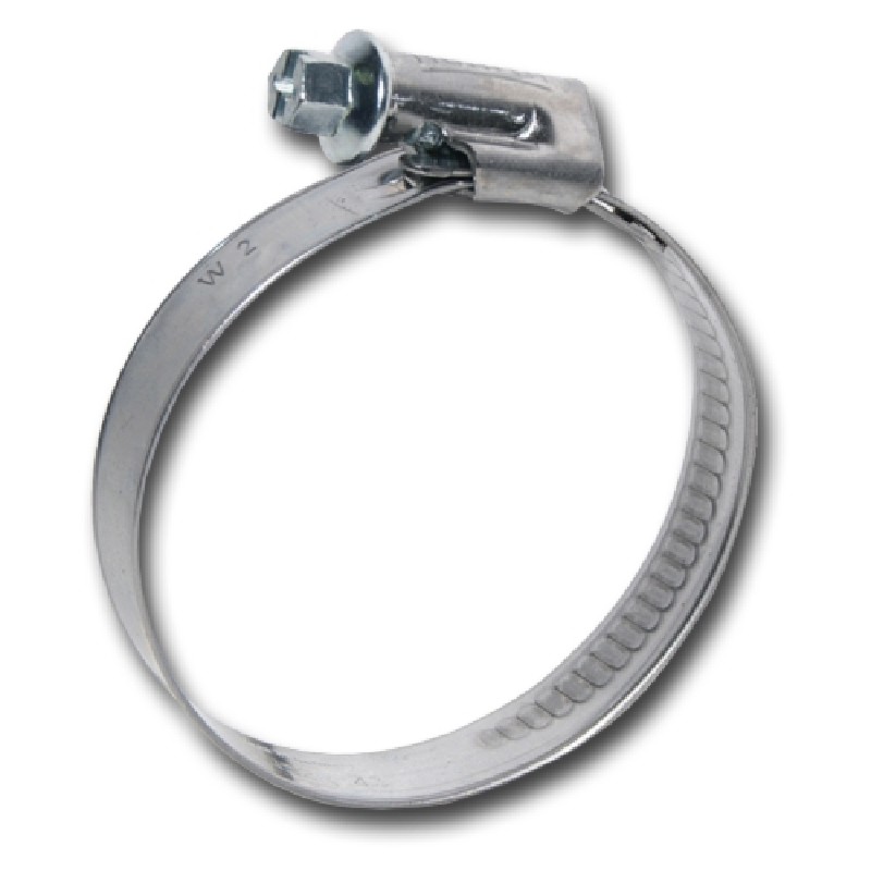 Abrazadera metálica 240-260. Ancho: 12 mm Calidad del material: W2: Fleje y jaula de acero inoxidable. X8Cr17 (DIN 1.4016) (AISI-430) y tornillo de acero cincado QST 34-3 (DIN 1.0213). Utilización: Las abrazaderas metálicas con ancho de fleje de 9 y 12 mm, así como las de acero inoxidable, son empleadas principalmente para los manguitos de agua del sistema de refrigeración del automóvil.